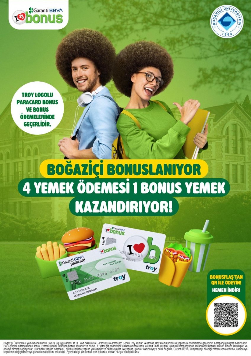 Boğaziçi Üniversitesi ile Garanti BBVA'nın iş birliğiyle tüm Boğaziçi Üniversitesi öğrencileri ve personeli için 4 yemek ödemesine 1 yemek tutarında bonus.
