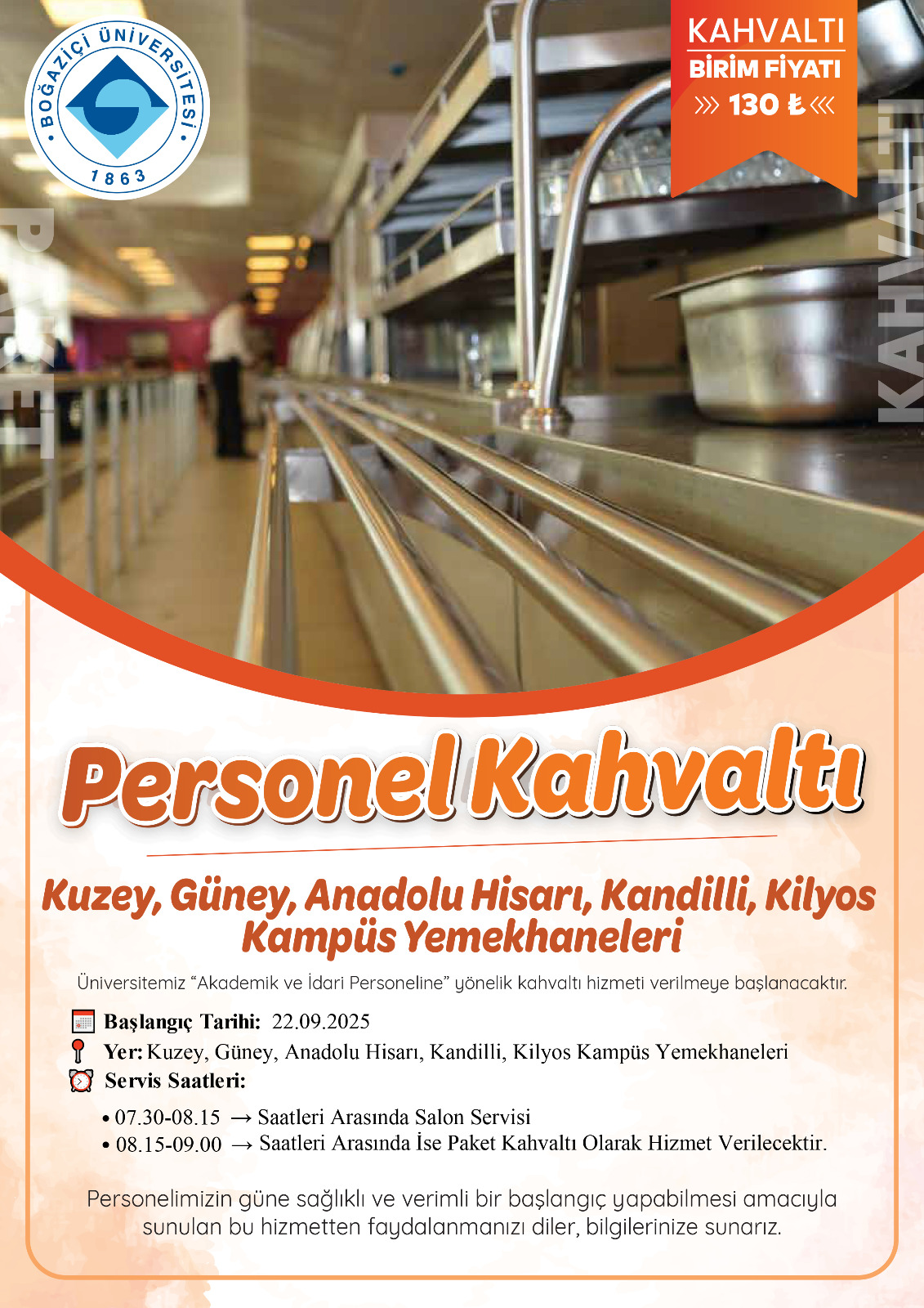 Üniversitemiz akademik ve idari personeline yönelik kahvaltı hizmeti 22 Eylül 2025 tarihinden itibaren Kuzey, Anadolu Hisarı, Güney, Kandilli ve Kilyos kampüs yemekhanelerinde verilmeye başlanacaktır.